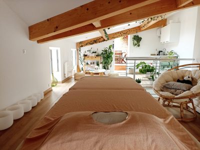 Situé au dernier étage de ma maison, il a été pensé pour que vous vous y sentiez bien. La salle de soins est à la fois lumineuse, chaleureuse et apaisante. La terrasse « sur les toits » offre une magnifique vue sur les Baous de Saint-Jeannet et de La Gaude, et permet de s’aérer tout en échangeant autour d’une boisson. J’aime particulièrement recevoir et pratiquer dans cet espace que je chouchoute avant et après les séances, afin qu’il soit tout le temps harmonisé et prêt à vous accueillir dans de belles vibrations.